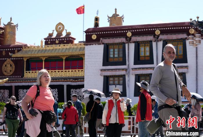 圖為外國游客在大昭寺廣場游覽。中新社記者 李林 攝