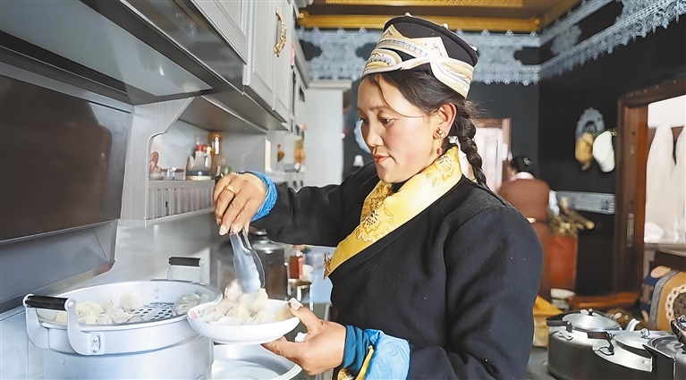 走進(jìn)村民堅阿措姆的家中,300多平方米的新房擁有明亮通透的客廳、設(shè)施齊全的衛(wèi)生間,她正在嶄新的廚房里忙著盛裝熱氣騰騰的牛肉包子招待客人。堅阿措姆的父親扎西歐珠介紹說:“我們是2024年底搬到新房子的。家里三代都住在一起,有8口人。以前一家人全擠在兩間房里,現(xiàn)在每個人都有了自己的房間,我們都非常高興。”談起新房,他激動不已,掩飾不住內(nèi)心的喜悅。