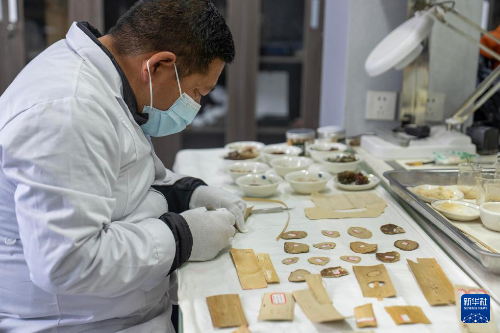 布達(dá)拉宮貝葉經(jīng)實(shí)驗性修復(fù)小組實(shí)驗室工作人員對貝葉進(jìn)行處理(5月25日攝)。新華社記者 李賀 攝