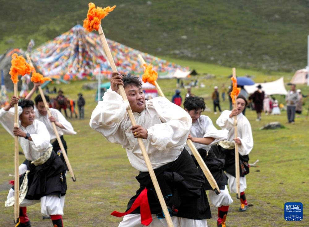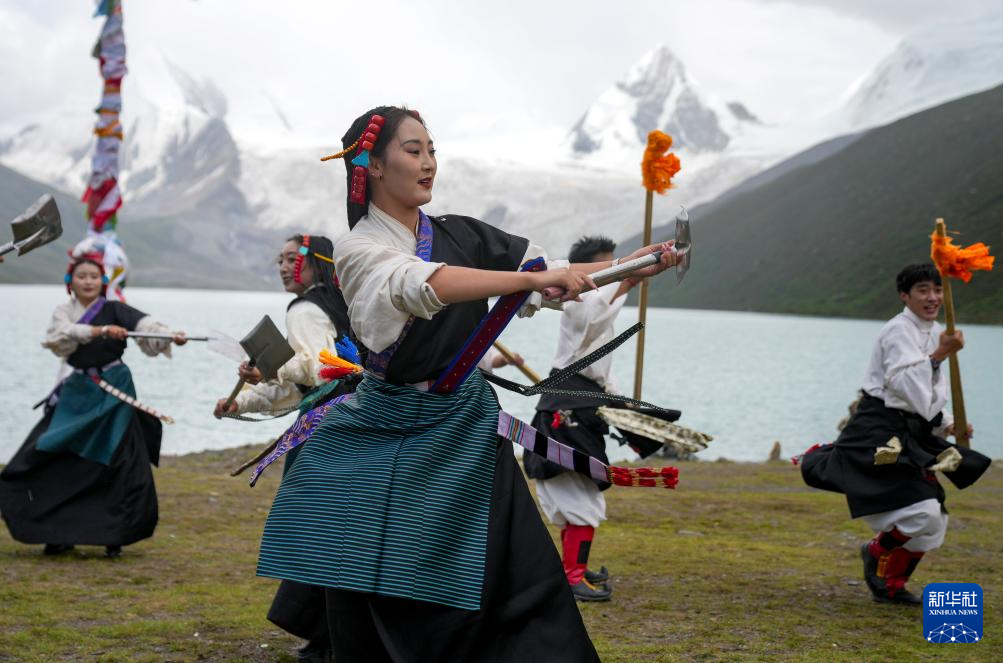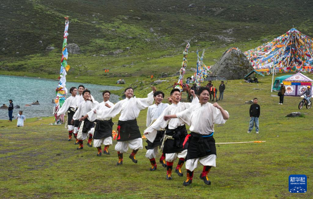 西藏那曲市比如縣藝術團的演員在薩普雪山景區(qū)為游客表演國家級非物質文化遺產(chǎn)舞蹈“達布阿諧”(7月19日攝)。這是該藝術團今年在景區(qū)開展的第6場非遺展演活動。新華社記者 晉美多吉 攝