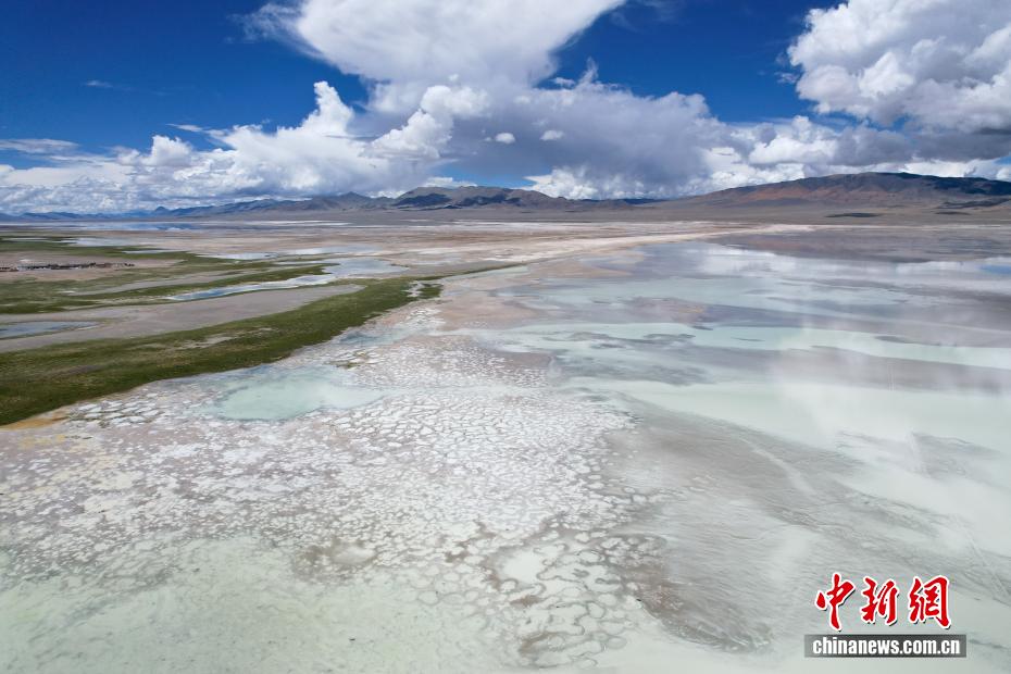 7月20日,航拍西藏阿里地區(qū)革吉縣鹽湖鄉(xiāng)境內(nèi)的鹽湖。一千多年前,阿里地區(qū)有50多家駐扎的鹽幫,將自然鹽用羊馱牛背邊放牧邊運輸?shù)姆绞?,運送到普蘭、日喀則、印度、尼泊爾等地,并用以物易物的方式換回青稞、磚茶、布料等日常生活所需的物品,從而孕育了遠(yuǎn)負(fù)盛名的“鹽羊古道”傳奇。近年來,當(dāng)?shù)亻_辦粗鹽巴加工廠、打造“鹽羊古道”旅游品牌等方式,使千年“鹽羊古道”煥發(fā)新生機。(無人機照片)中新社記者 張祥毅 攝