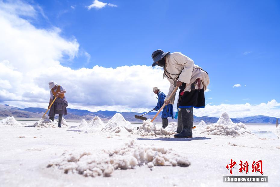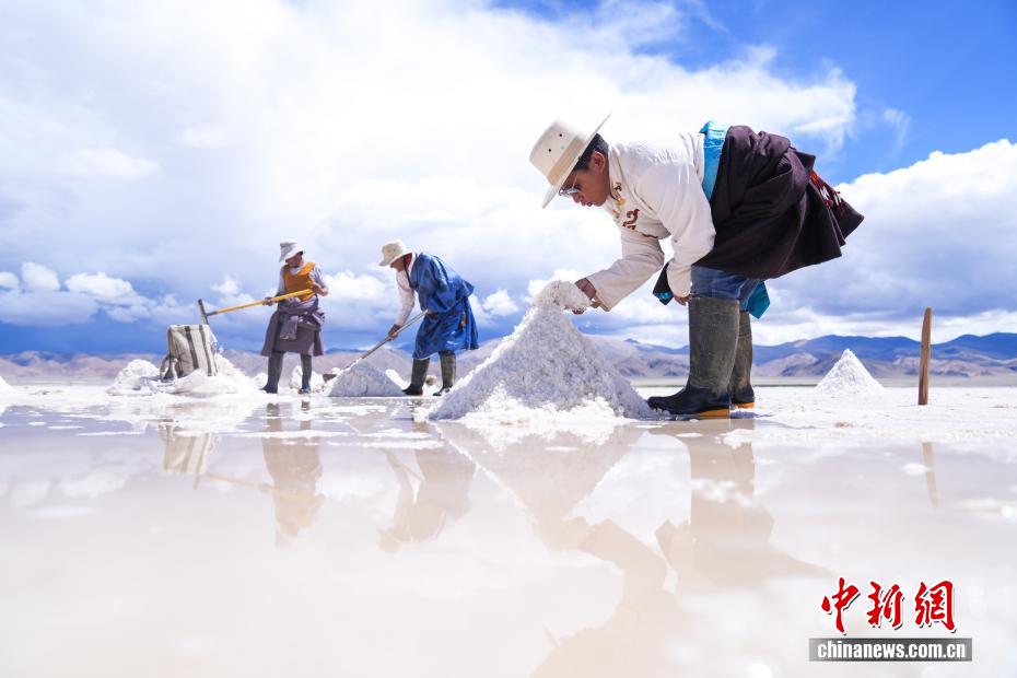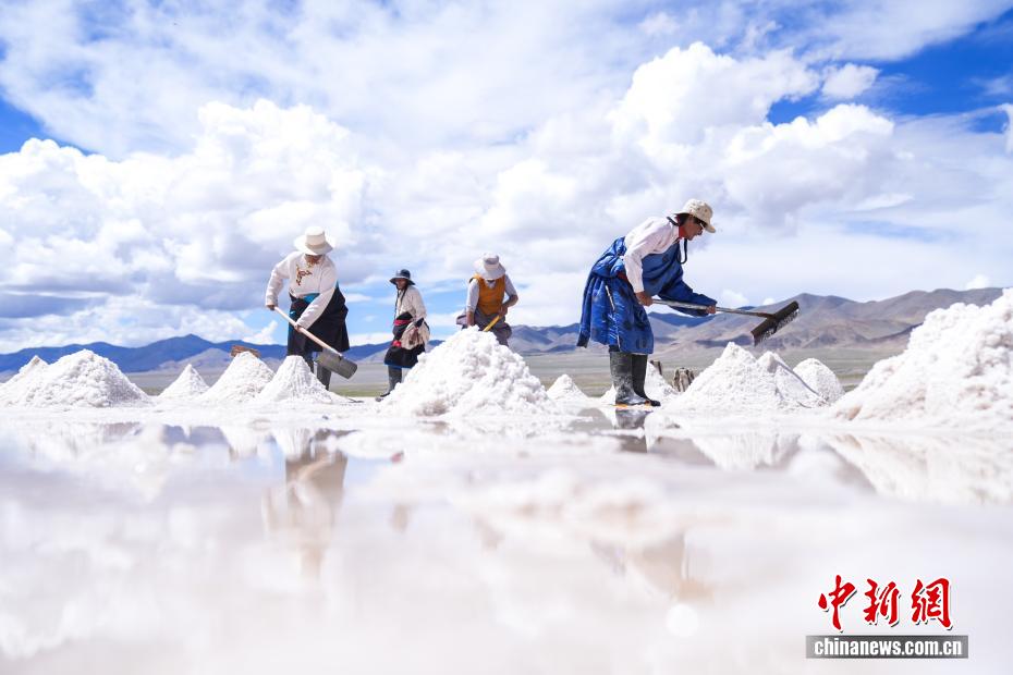 7月20日,在西藏阿里地區(qū)革吉縣鹽湖鄉(xiāng),民眾在鹽湖中采制粗鹽巴。一千多年前,阿里地區(qū)有50多家駐扎的鹽幫,將自然鹽用羊馱牛背邊放牧邊運輸?shù)姆绞?,運送到普蘭、日喀則、印度、尼泊爾等地,并用以物易物的方式換回青稞、磚茶、布料等日常生活所需的物品,從而孕育了遠(yuǎn)負(fù)盛名的“鹽羊古道”傳奇。近年來,當(dāng)?shù)亻_辦粗鹽巴加工廠、打造“鹽羊古道”旅游品牌等方式,使千年“鹽羊古道”煥發(fā)新生機。中新社記者 張祥毅 攝