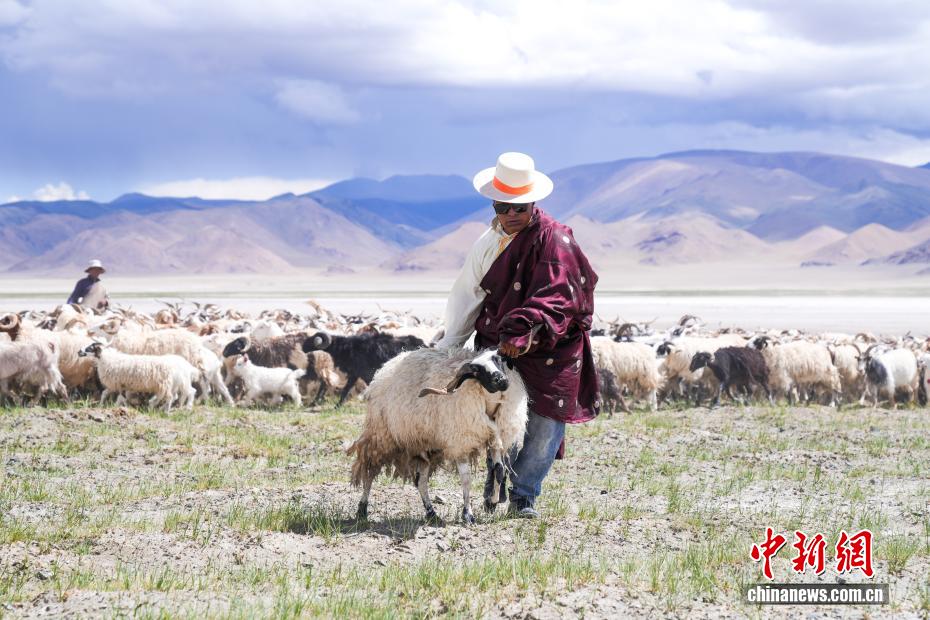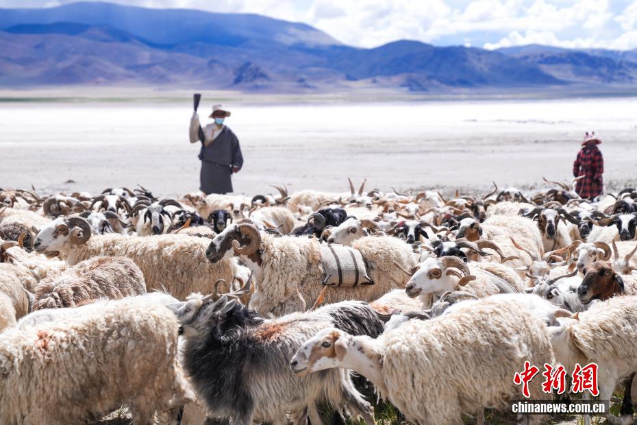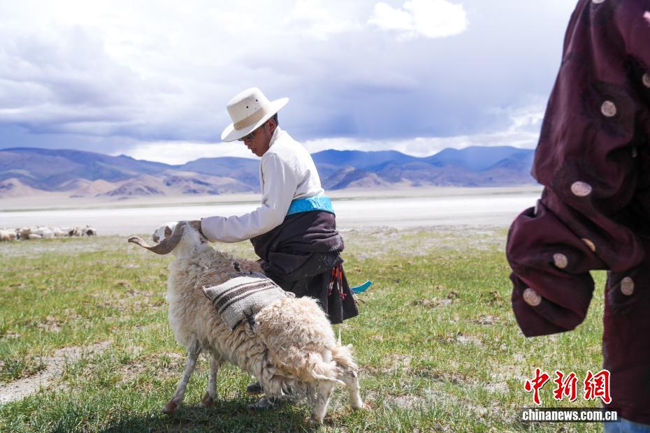 7月20日,在西藏阿里地區(qū)革吉縣鹽湖鄉(xiāng),牧民從羊群中牽引一只將要馱負(fù)鹽袋的羊。一千多年前,阿里地區(qū)有50多家駐扎的鹽幫,將自然鹽用羊馱牛背邊放牧邊運輸?shù)姆绞?,運送到普蘭、日喀則、印度、尼泊爾等地,并用以物易物的方式換回青稞、磚茶、布料等日常生活所需的物品,從而孕育了遠(yuǎn)負(fù)盛名的“鹽羊古道”傳奇。近年來,當(dāng)?shù)亻_辦粗鹽巴加工廠、打造“鹽羊古道”旅游品牌等方式,使千年“鹽羊古道”煥發(fā)新生機。中新社記者 張祥毅 攝