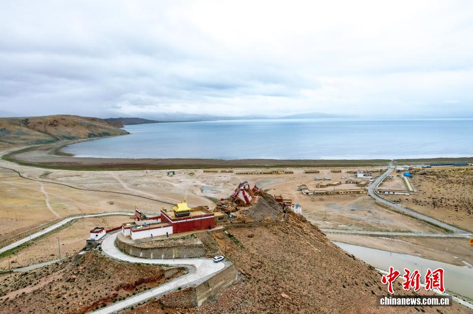 7月22日,航拍拉昂錯(cuò)夏日風(fēng)光。瑪旁雍錯(cuò)與拉昂錯(cuò)位于西藏阿里地區(qū)普蘭縣境內(nèi),兩湖僅有一堤之隔,卻擁有不同的地理特征和咸淡水之分,因而分別被譽(yù)為“圣湖”與“鬼湖”。(無人機(jī)照片)中新社記者 張祥毅 攝