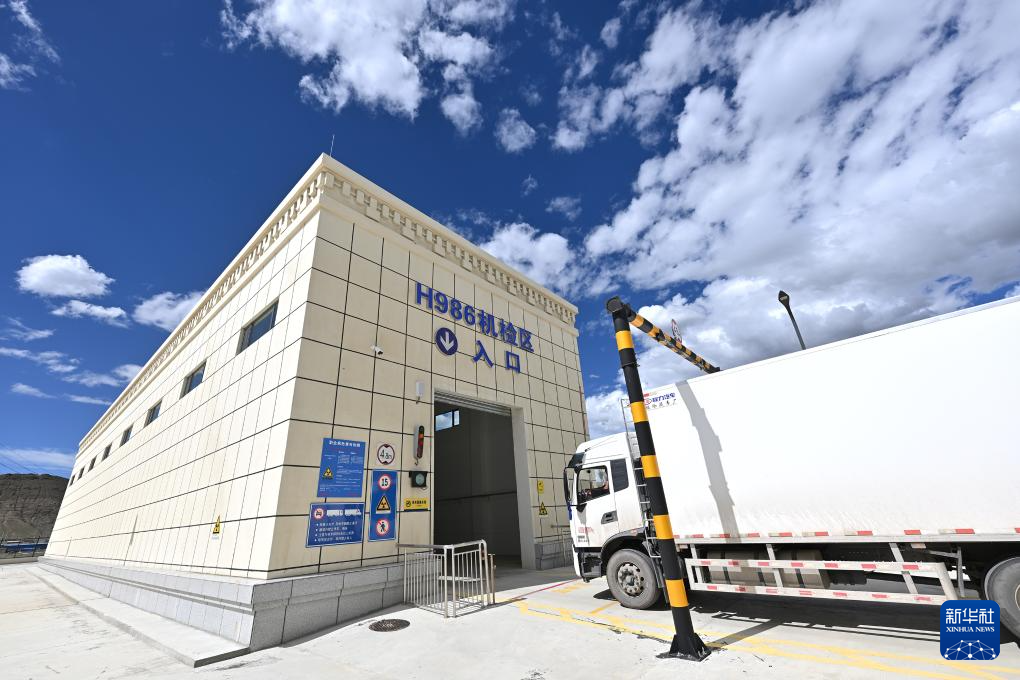 7月16日,貨車通過日喀則國際陸地港出口貨物查驗場卡口。新華社記者 李鑫 攝