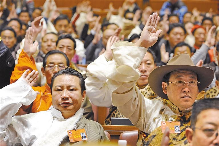 在舊西藏,占總?cè)丝诓坏?%的三大領主(官家、貴族和寺院上層僧侶)占有全部生產(chǎn)資料,而占總?cè)丝?5%以上的農(nóng)奴和奴隸沒有人身自由。西藏民主改革特別是西藏自治區(qū)成立以來,民族區(qū)域自治制度得到堅決貫徹,各族人民參與民主政治建設的熱情持續(xù)高漲:農(nóng)奴的后代當選人大代表,通過人民代表大會制度參與國家治理;截至目前,全區(qū)四級人大代表42000余人中,藏族和其他少數(shù)民族約占89%;門巴、珞巴等人口不足萬人的民族,在全國及西藏人大均有代表——雪域高原各族兒女依法行使民主權利,真正成為命運的主宰者。
