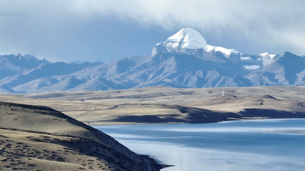 瑪旁雍錯湖畔遠(yuǎn)眺,岡仁波齊靜立天際。新華社記者 黃智琪 攝