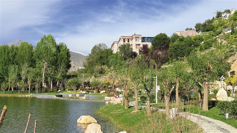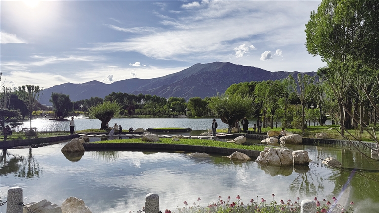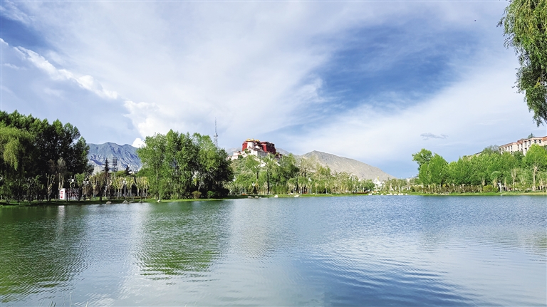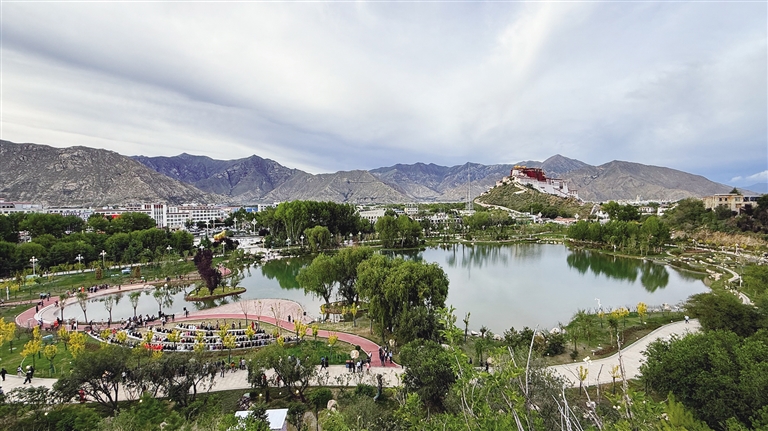 拉薩團(tuán)結(jié)公園坐落于布達(dá)拉宮西麓、藥王山腳下。昔日,這里房屋高低錯(cuò)雜、線纜交錯(cuò)密布、市場喧鬧擁擠、環(huán)境喧囂擾攘,不僅影響城市形象和生態(tài)環(huán)境,還影響出行游玩體驗(yàn)。如今,湖水如碧綢般清澈,岸邊綠樹成蔭,各類花卉競相綻放,昔日雜亂之地已蛻變?yōu)轸浯涿髦椋宋墓袍E與自然景致相映成趣,共同繪就出“百澤繞城·水城相依”的生態(tài)文明畫卷。