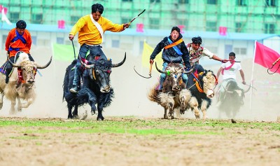 西藏拉薩市達孜區(qū),農(nóng)牧民群眾在參加賽牦牛比賽。新華社發(fā)