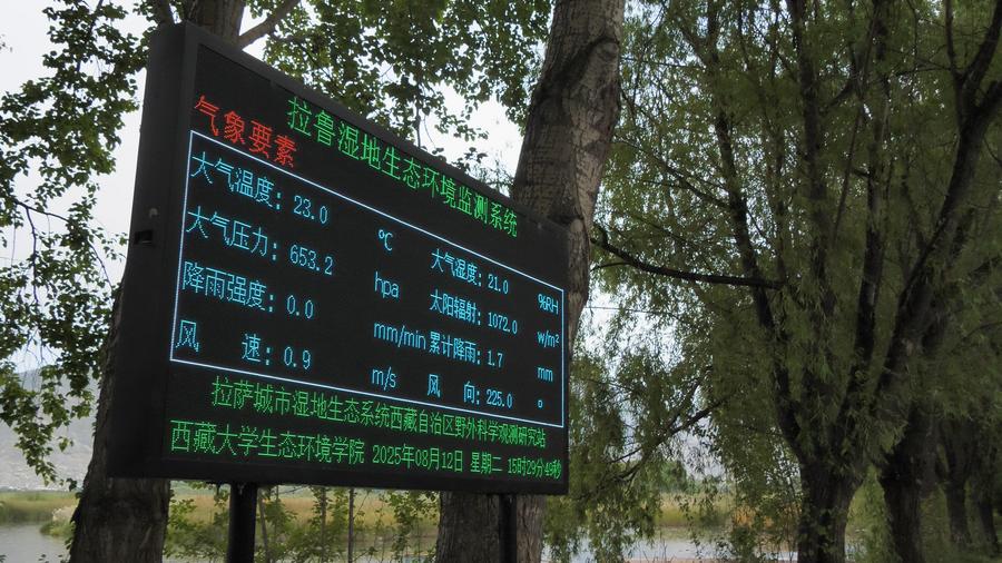 拉魯濕地國家級自然保護區(qū)南門內的生態(tài)環(huán)境監(jiān)測系統(tǒng)顯示屏,實時顯示濕地內的氣象要素、土壤和水環(huán)境、植被指數(shù)等數(shù)據(jù)。新華社記者 黃智琪 攝