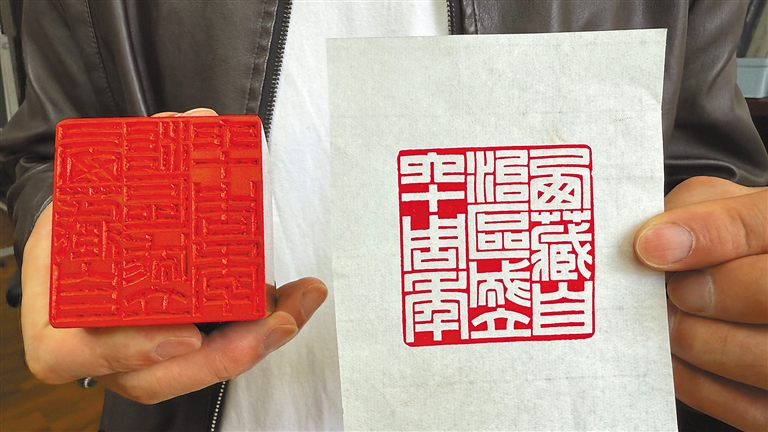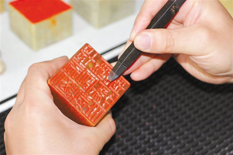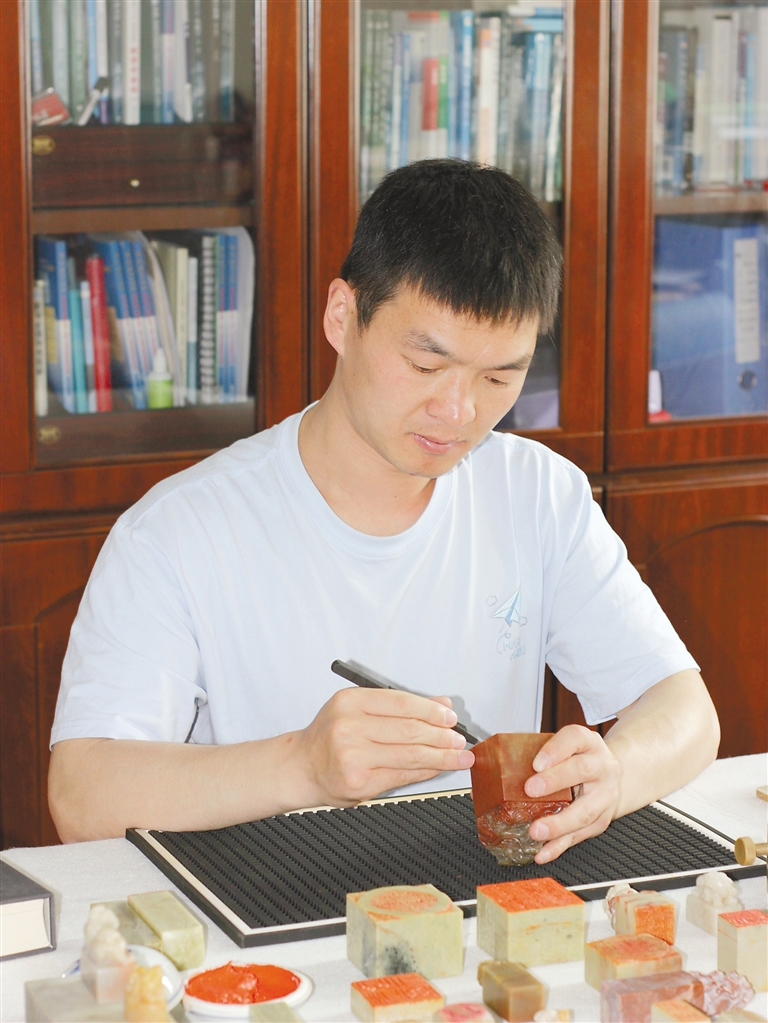 徐帥展示已完成的“西藏自治區(qū)成立60周年”篆刻藝術(shù)作品。