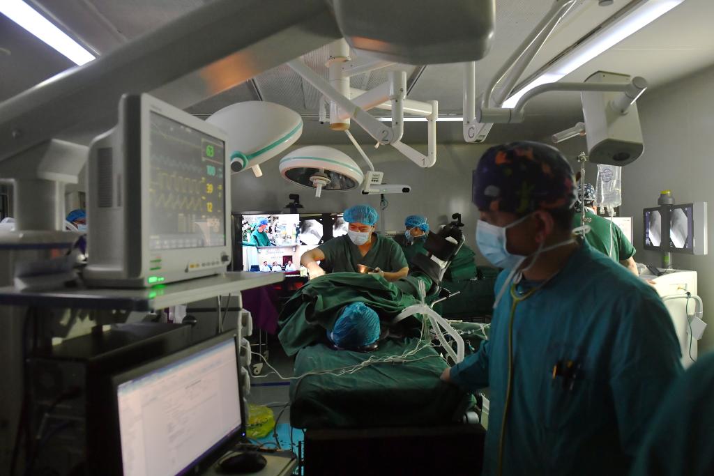 2021年4月19日,拉薩市人民醫(yī)院骨科醫(yī)生在北京積水潭醫(yī)院專家遠程指導下使用骨科機器人開展骨科手術。 新華社記者 孫瑞博 攝