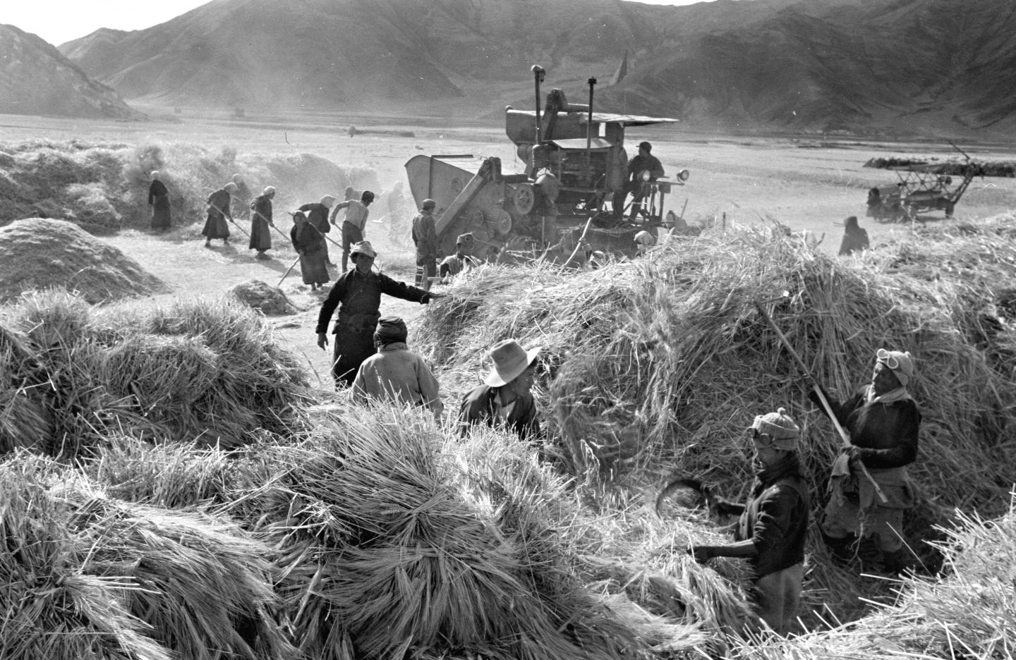 1965年,西藏國營澎波農場的藏族工人在使用農機脫粒。新華社記者 吳祖政 攝