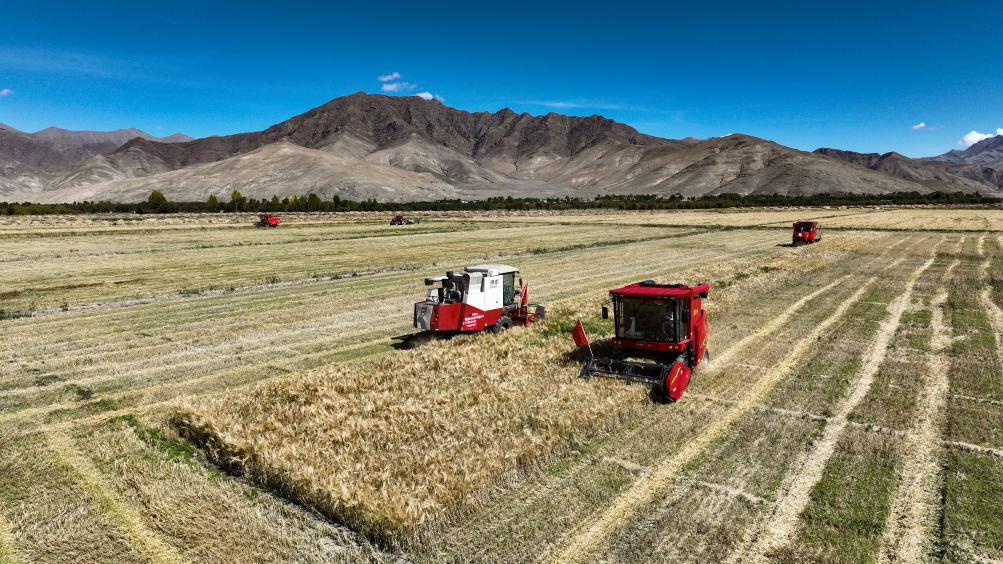 2022年9月19日,西藏日喀則市江孜縣熱索鄉(xiāng)努康村農機合作社的村民集中對村里三千多畝耕地進行機械化收割。新華社記者 晉美多吉 攝