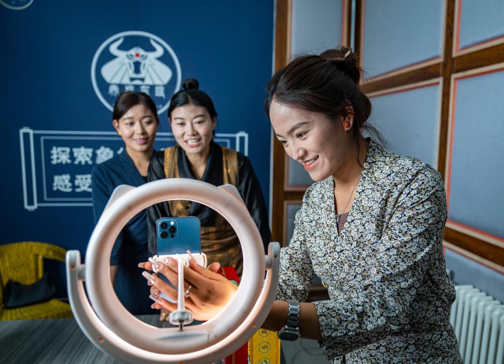 2023年10月29日,在西藏那曲巴青縣“赤堆東雄”直播間,主播朗貢旺姆調試直播設備。新華社記者 孫非 攝