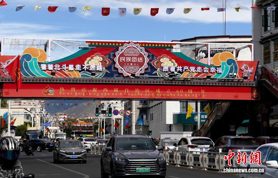 8月19日,隨著西藏自治區(qū)成立60周年慶?;顒?dòng)臨近,拉薩氛圍濃。拉薩街頭,處處是張燈結(jié)彩的盛景,洋溢著一派祥和與歡騰的氛圍。圖為拉薩裝扮一新的街頭。中新社記者 李林 攝