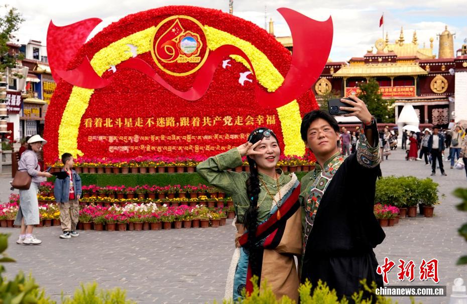 8月19日,隨著西藏自治區(qū)成立60周年慶祝活動(dòng)臨近,拉薩氛圍濃。拉薩街頭,處處是張燈結(jié)彩的盛景,洋溢著一派祥和與歡騰的氛圍。圖為游客在拉薩大昭寺廣場(chǎng)上的大慶宣傳標(biāo)語(yǔ)前留念。旦增卓瑪 攝