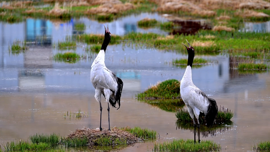說到這里,次成塔青突然轉(zhuǎn)過身,看向高高麗麗和它們的孩子。開始下雨了,水面上鋪滿了細(xì)密的漣漪,而在濕地中央那一個不大的巢上,是一動不動、用身子緊緊護(hù)住孩子的黑頸鶴??粗@一幕,風(fēng)雨似乎也沒有那么刺骨了……