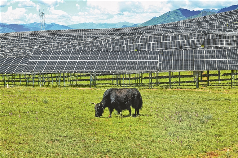 熱瓦鄉(xiāng)熱熱村是典型的牧業(yè)村,位于那曲市索縣的群山峻嶺之間。2023年12月,西藏開投集團(tuán)投資建設(shè)的50MW牧光互補(bǔ)儲(chǔ)能項(xiàng)目在這里并網(wǎng)發(fā)電,遠(yuǎn)遠(yuǎn)望去像是山坡上的“藍(lán)色湖泊”。牧民們每天會(huì)趕著羊群來這里放牧,陽光透過光伏板的縫隙灑在草地上,羊群在陰涼下自由覓食。在光伏板的“庇護(hù)”下,不僅山地植被可以免受烈日大風(fēng)的侵襲,還能對(duì)養(yǎng)殖的動(dòng)物起到保護(hù)效果,在充分利用光能優(yōu)勢(shì)的同時(shí),為鄉(xiāng)村振興注入新動(dòng)能,實(shí)現(xiàn)企業(yè)和農(nóng)牧民雙向受益。
