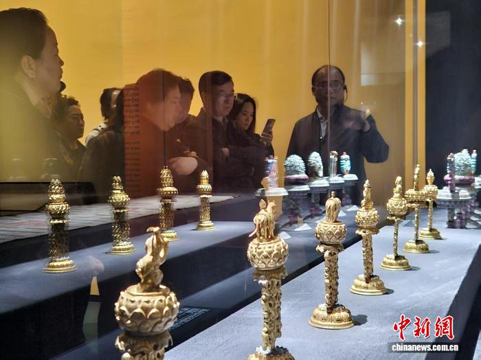 西藏自治區(qū)文物局黨組副書記、局長曲珍介紹,本次展覽精選95件套(114件)珍貴文物,涵蓋瓷器、玉器、唐卡、造像等,集中展現(xiàn)了古代西藏與祖國內(nèi)地交往交流交融的歷史畫卷。其中,故宮博物院七世達(dá)賴進(jìn)獻(xiàn)乾隆皇帝的觀音菩薩像、六世班禪進(jìn)獻(xiàn)乾隆皇帝的佛窩、六世班禪額爾德尼九歲像等是首次回藏“探親”。另有來自西藏博物館的明代青花云龍紋執(zhí)壺,布達(dá)拉宮管理處的康熙御制銅胎畫琺瑯蓮花蓋碗,羅布林卡管理處的鍍金銅七珍寶等展出。