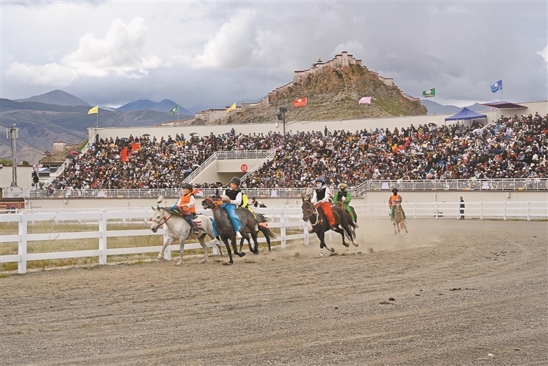 開幕式上,100位騎手策馬奔騰,繞場致意。隨后,擊鼓迎賓、紅色鼓陣、車仁望果、千年名城、英雄江孜、青稞之鄉(xiāng)等10個(gè)方隊(duì)和來自各鄉(xiāng)鎮(zhèn)的賽馬隊(duì)依次入場,全方位、多角度展示了江孜縣特色產(chǎn)業(yè)興旺、基礎(chǔ)設(shè)施提升、民生持續(xù)改善的美好圖景,展現(xiàn)了新時(shí)代英雄城兒女堅(jiān)韌不拔、昂揚(yáng)向上的精神風(fēng)貌,深情表達(dá)了江孜人民對(duì)黨的無限感恩、對(duì)祖國的無限熱愛、對(duì)西藏繁榮發(fā)展的美好祝愿。