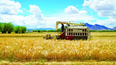 大型收割機在金色青稞田間穿梭。資料圖片