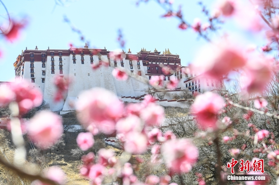 3月15日,杏花映襯下的布達拉宮。新華網(wǎng) 旦增努布 攝