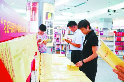 為配合“不忘初心、牢記使命”主題教育,北京圖書大廈專門設立《習近平新時代中國特色社會主義思想學習綱要》圖書專臺,連日來深受讀者喜愛。圖為7月25日,讀者正在認真閱讀《習近平新時代中國特色社會主義思想學習綱要》一書。本報記者 閆匯芳攝/光明圖片