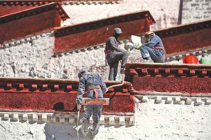 世界文化遺產(chǎn)布達(dá)拉宮10月26日起迎來了一年一度的粉刷季,工作人員將用10余天的時(shí)間對(duì)宮墻、白塔、窗框進(jìn)行整體粉刷,為布達(dá)拉宮美顏。圖為10月28日,施工人員給布達(dá)拉宮墻體噴灑涂料。記者 李洲 洛桑 攝