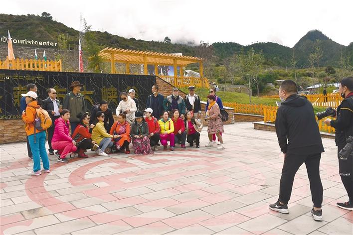 圖為來(lái)自四川的旅行團(tuán)在大峽谷景區(qū)門口合影。本報(bào)記者 張猛 胡文 攝