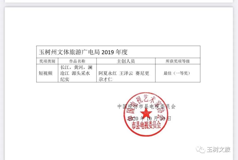 在當(dāng)天舉行的第八屆全國市縣電視臺、融媒體中心推優(yōu)展播活動表彰晚會上,全國100多家市縣電視臺、融媒體中心的代表和來自全國各地的領(lǐng)導(dǎo)、嘉賓齊聚?;顒蝇F(xiàn)場頒發(fā)了最佳短視頻單位、最佳電視專題單位、最佳電視欄目單位、最佳綜藝晚會單位、媒體融合先導(dǎo)單位等獎項。玉樹藏族自治州文體旅游廣電局獲最佳短視頻單位,其2019年度短視頻作品《長江、黃河、瀾滄江源采水紀(jì)實宣傳片》獲得“最佳短視頻一等獎”榮譽。