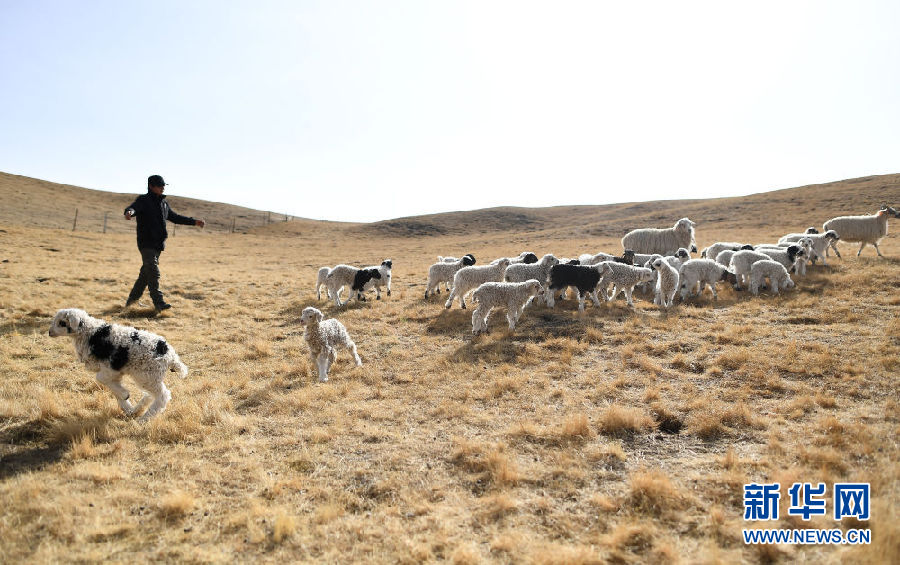 在青海省剛察縣泉吉鄉(xiāng)寧夏村,達日杰家的小羊羔在草場上(11月12日攝)。 新華社記者 張宏祥 攝