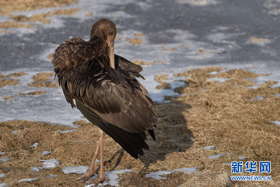 12月6日,一只黑鸛在西寧市北川河濕地公園內整理羽毛。新華社記者 吳剛 攝