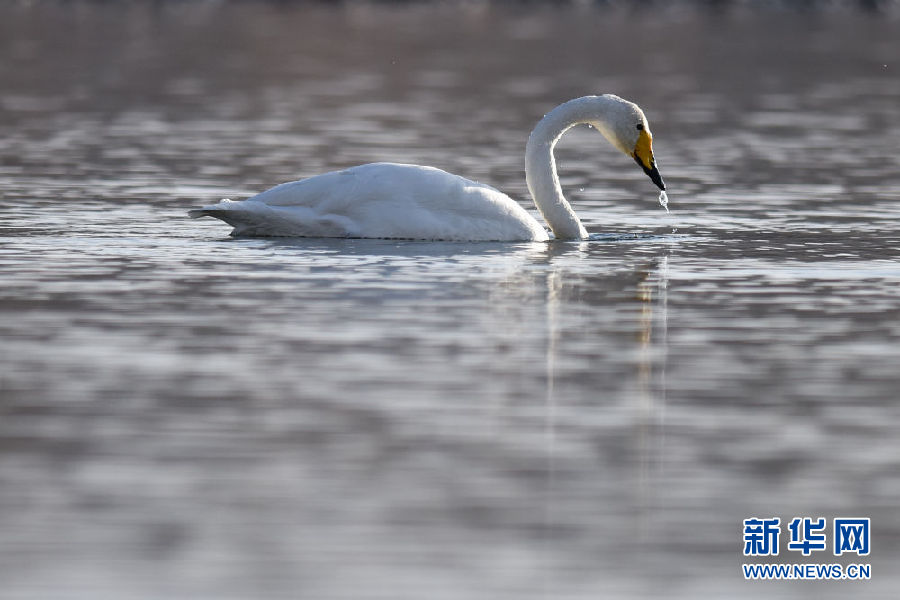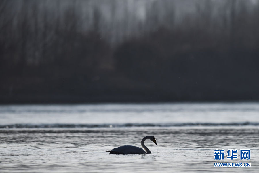 12月11日,一只大天鵝在青海省貴德縣境內(nèi)的黃河里覓食。新華社記者 吳剛 攝