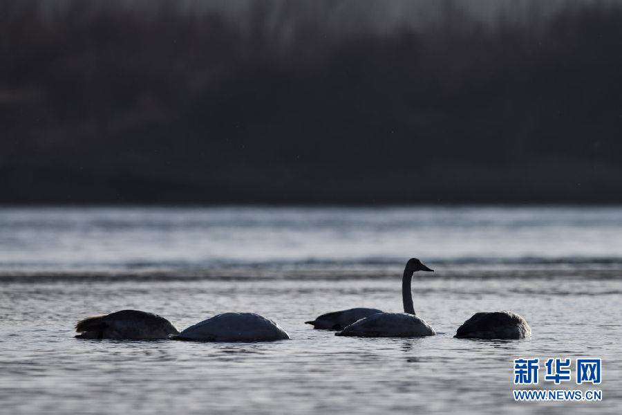 12月11日,幾只大天鵝在青海省貴德縣境內(nèi)的黃河里游弋。新華社記者 吳剛 攝