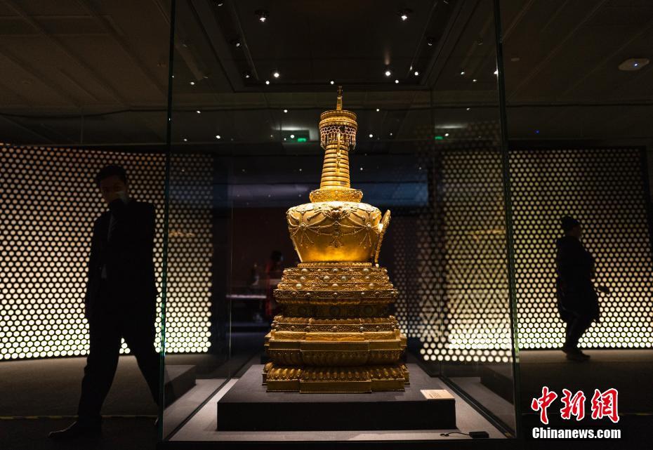 12月16日,“妙寶莊嚴——故宮博物院藏法器展”在北京嘉德藝術中心開展。113件從北京故宮博物院藏宮廷法器中精選出的展品首次大規(guī)模出宮展出。圖為“乾隆款銅鍍金嵌松石佛塔”展品。中新社記者 侯宇 攝