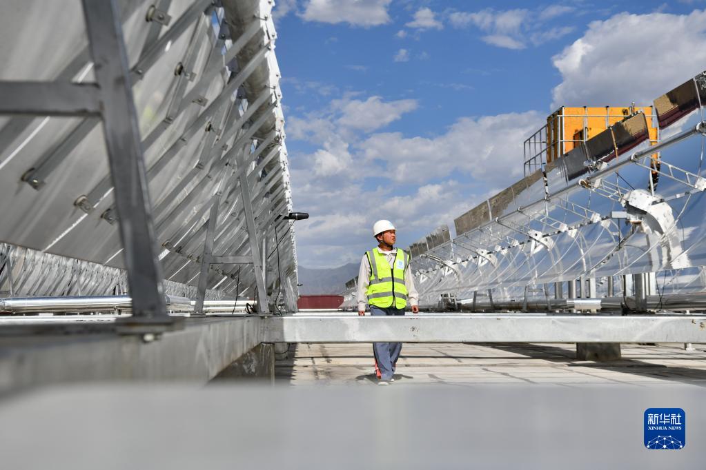 中建一局工作人員檢查高散輻射主動式太陽能供暖設備(7月6日攝)。新華社記者 晉美多吉 攝