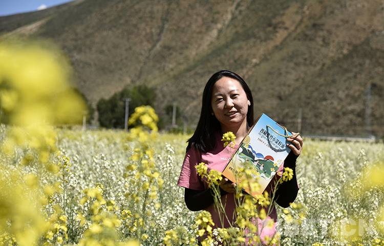 圖為墨竹工卡縣松贊文化旅游節(jié)暨第五屆油菜花節(jié)開幕式后,現(xiàn)場觀眾手捧有幸抽到的開幕式紀念品在油菜花海中留影 攝影:王媛媛