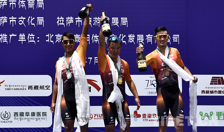 圖為7月23日,2022環(huán)拉薩城自行車大賽公路自行車男子精英組前三名侯棟乙(中)、胡志超(左)、孫小龍(右)在頒獎儀式上慶祝 攝影:王媛媛
