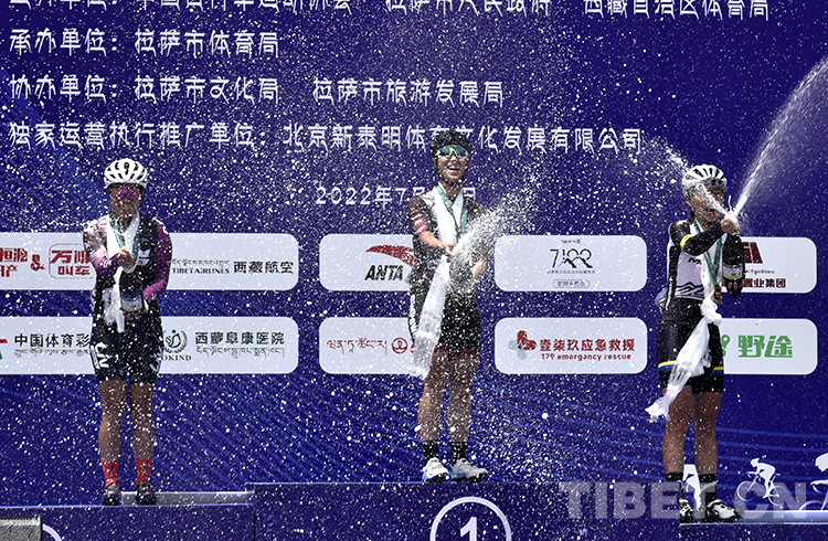 圖為7月23日,2022環(huán)拉薩城自行車大賽山地自行車女子公開組前三名高艷嬌(中)、何艷(左)、宋寒冰(右)在頒獎儀式上開香檳慶祝 攝影:王媛媛