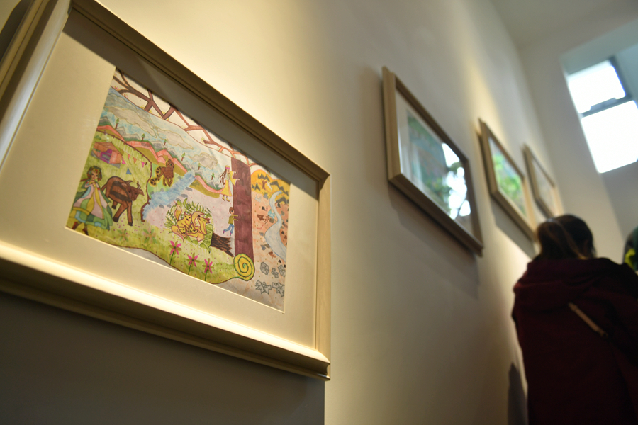 圖為祁連山國(guó)家公園青海片區(qū)展陳中心內(nèi)展出的兒童繪畫作品。