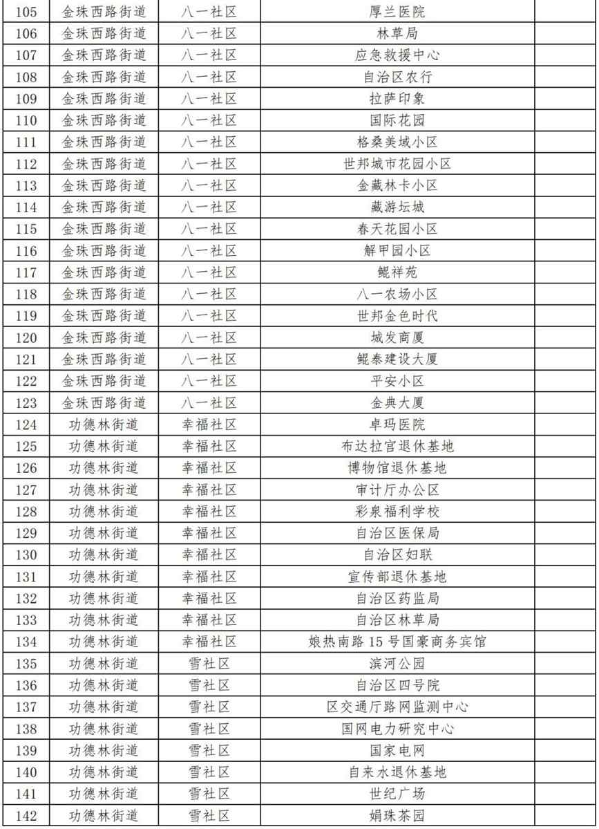 14.金珠西路街道八一社區(qū)一、二、三、六網(wǎng)格(自治區(qū)商務(wù)廳、紅十字會(huì)、八一校、老劉出租房、云水瑤、城發(fā)大廈、當(dāng)巴小學(xué)、城投大廈、藏藥博物館、八一菜市場(chǎng)、厚蘭醫(yī)院、林草局、應(yīng)急救援中心、自治區(qū)農(nóng)行、拉薩印象、國(guó)際花園);