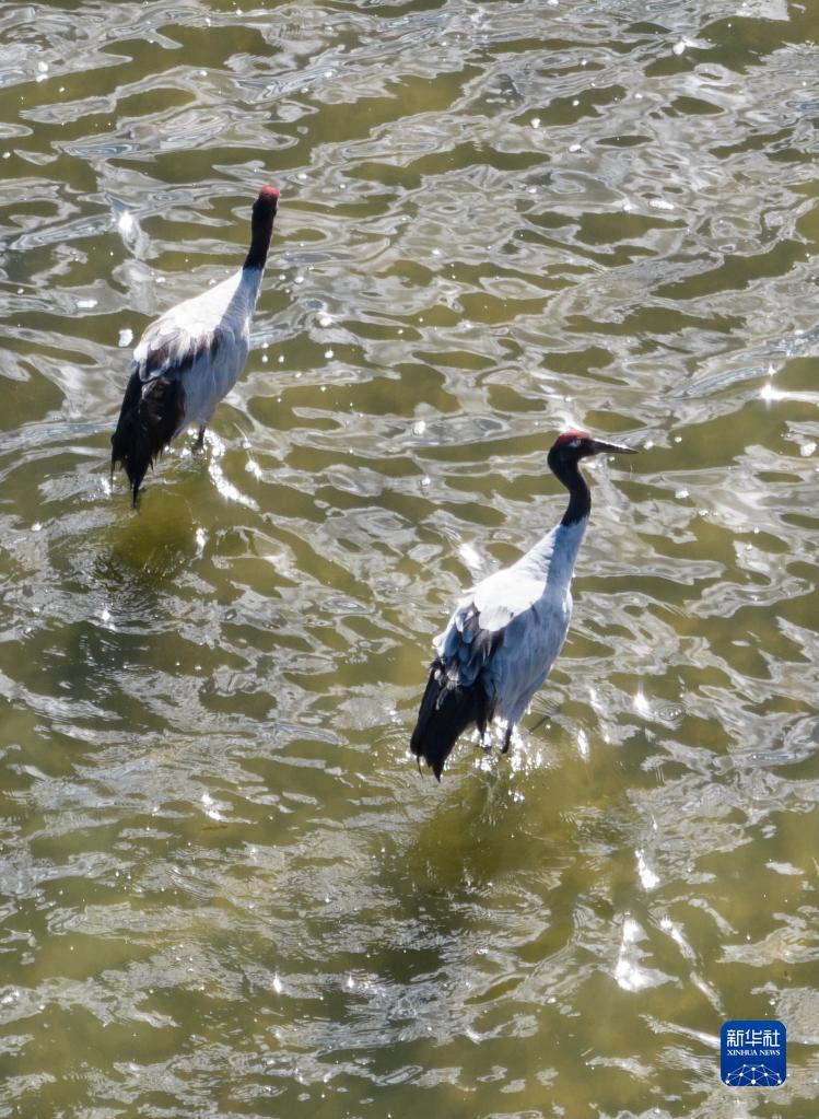 9月16日在多慶湖邊拍攝的黑頸鶴(無人機(jī)照片)。新華社記者 晉美多吉 攝
