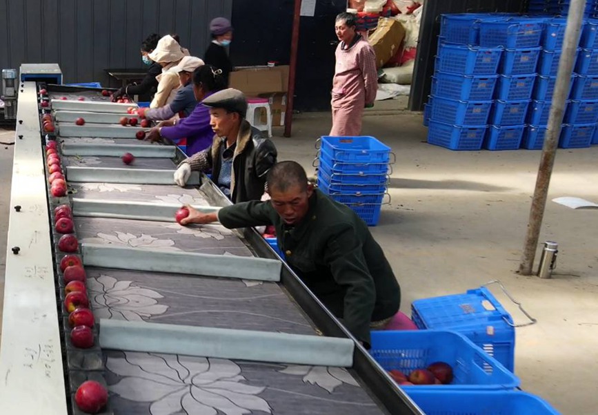 走進(jìn)果園,昔日凹凸不平的塊狀農(nóng)田上,整齊排列的果樹一眼望不到頭,枝頭上的蘋果更是一茬接一茬的生長,有的深紅、有的淺紅、有的還泛青、有的則包著保護(hù)袋等待采摘,它們沉甸甸的,是果農(nóng)們致富的現(xiàn)實圖景。幾十名當(dāng)?shù)卮迕裾诠麍@里忙碌著,有的在清除雜草、有的在采摘、有的在做防護(hù),分工有序,干勁十足。