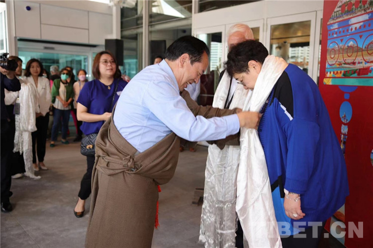 活動(dòng)中,班覺(jué)才仁會(huì)長(zhǎng)為鄧先生獻(xiàn)上哈達(dá),祝福這次展出圓滿成功!