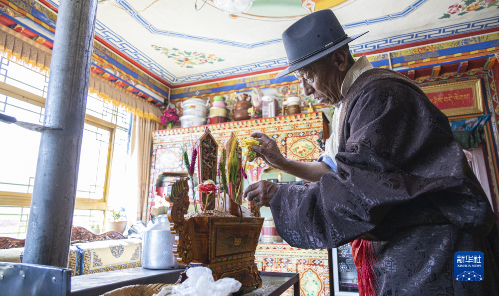 2月20日,在位于西藏拉薩市墨竹工卡縣門巴鄉(xiāng)的家中,扎西次仁用五彩青稞穗裝點象征吉祥的“切瑪”。新華社記者 孫非 攝