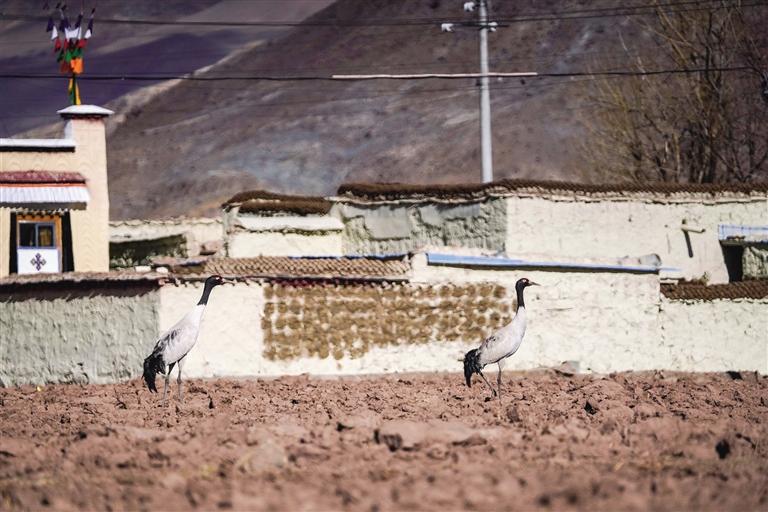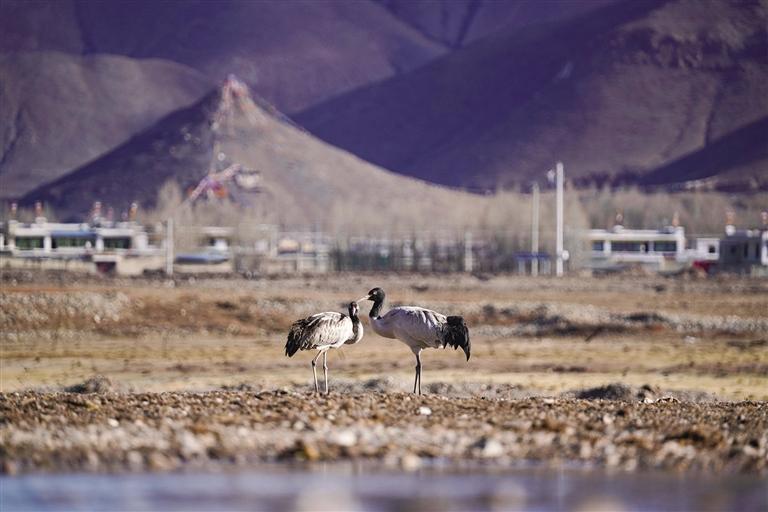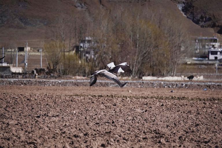 黑頸鶴是國家一級保護動物,在藏語中稱為“沖沖”。主要棲息在海拔2500米至5000米的高原、草甸、沼澤地帶。拉薩北部的林周縣平均海拔約4200米,是黑頸鶴的主要越冬地之一。最近這段時間,對拉薩市林周縣野保員們來說,一邊要忙自家的農(nóng)活,一邊還要巡查候鳥情況。“已經(jīng)有一小部分飛走了,估計再過半個月都會陸續(xù)飛走?!?月23日上午,野保員旦增告訴記者,在虎頭山水庫和卡孜水庫越冬的候鳥有一部分已經(jīng)飛走了。野保員口中的“飛走”便是遷徙,遷徙是候鳥的本能,一年一年,跟隨時間的召喚,完成兩次遷徙:繁殖和越冬。