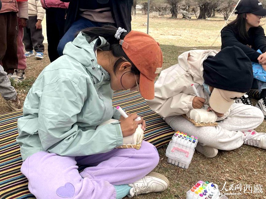 圖為活動(dòng)現(xiàn)場(chǎng),小朋友在牛皮船上進(jìn)行繪畫。人民網(wǎng) 郝潔攝