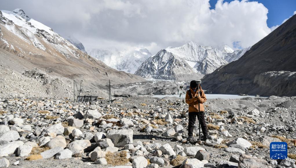 在珠峰登山大本營附近,科考隊(duì)員對(duì)冰川進(jìn)行實(shí)時(shí)差分GPS定位(5月15日攝)。新華社記者 晉美多吉 攝