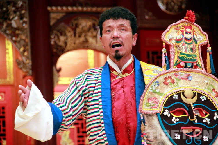 圖為拉薩市城關(guān)區(qū)娘熱民間藝術(shù)團(tuán)演員洛桑卓瑪表演藏戲開(kāi)場(chǎng)《溫巴頓》片段 攝影:劉莉